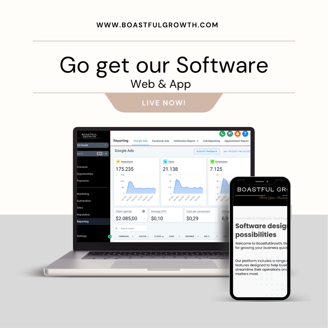BoastfulGrowth is more than just a software - it's a tool designed to help your business achieve endless possibilities. With our platform, you can streamline your operations, connect with customers, and focus on what matters most to you.